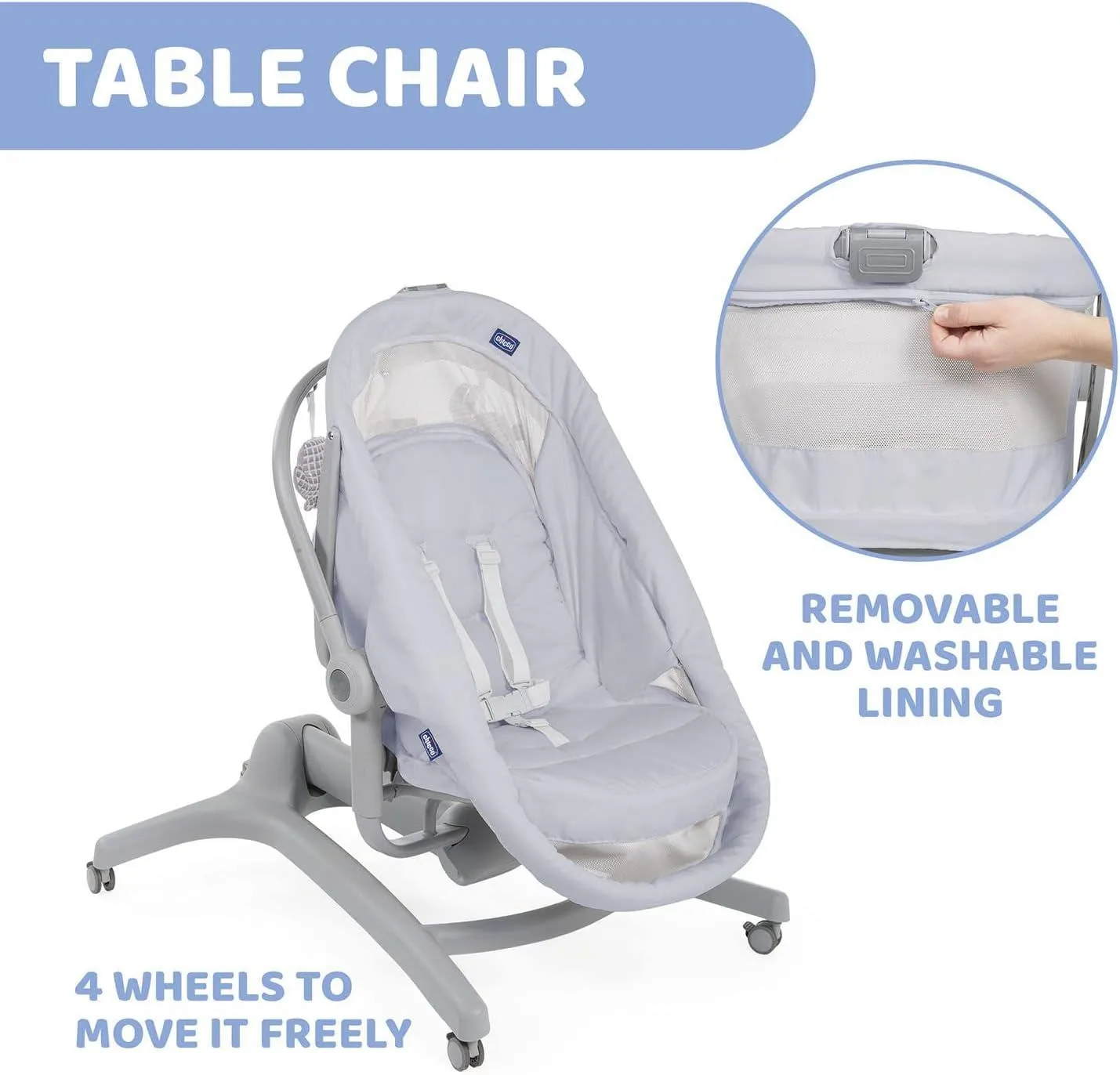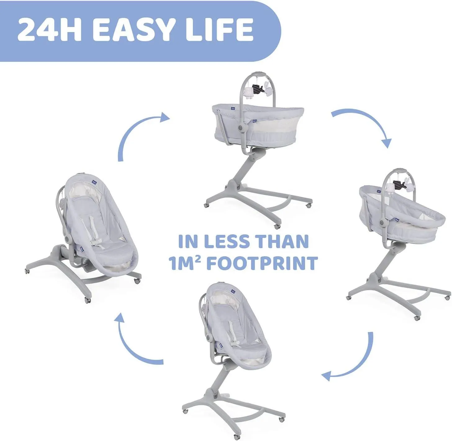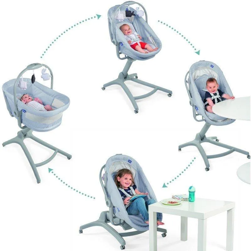 Minicuna Multifunción Baby Hug 4 en 1 CHICCO. La solución multifuncional perfecta para la rutina diaria del bebé dentro de casa. 4 en 1: Moisés de día (0 M+), Hamaca (0m+), Trona (6M+) y Primera Silla (6M+).