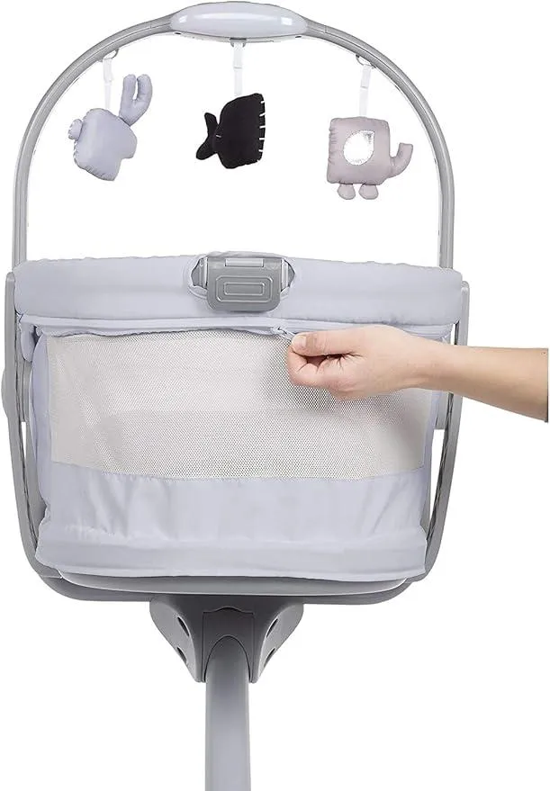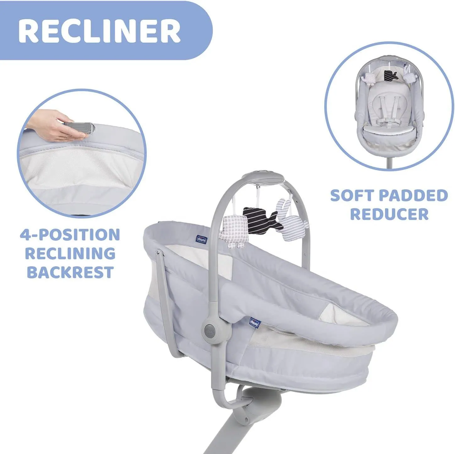 HAMACA (0-6 meses). Gracias al respaldo reclinable y su altura regulable, Baby Hug puede moverse contigo por la casa y entretener al bebé con su barra de juegos electrónica.