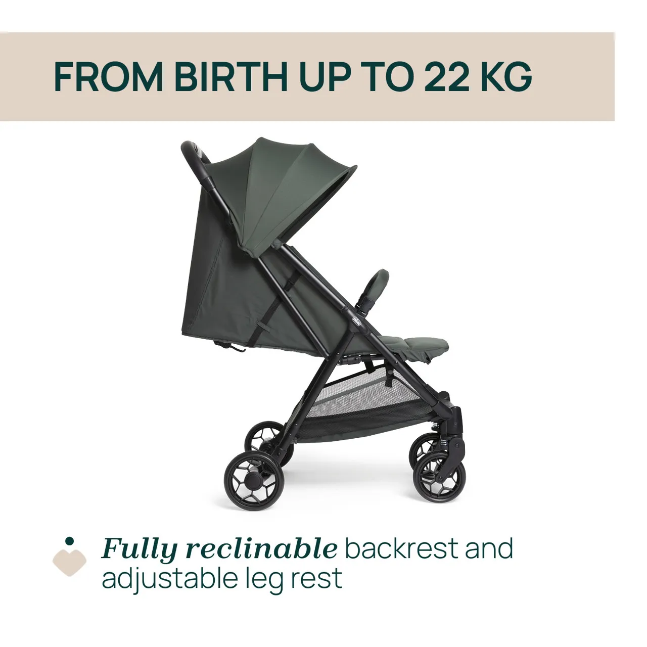 El respaldo del cochecito Urbino es completamente reclinable y se puede ajustar en diferentes posiciones gracias a la cinta que se puede operar con una sola mano.