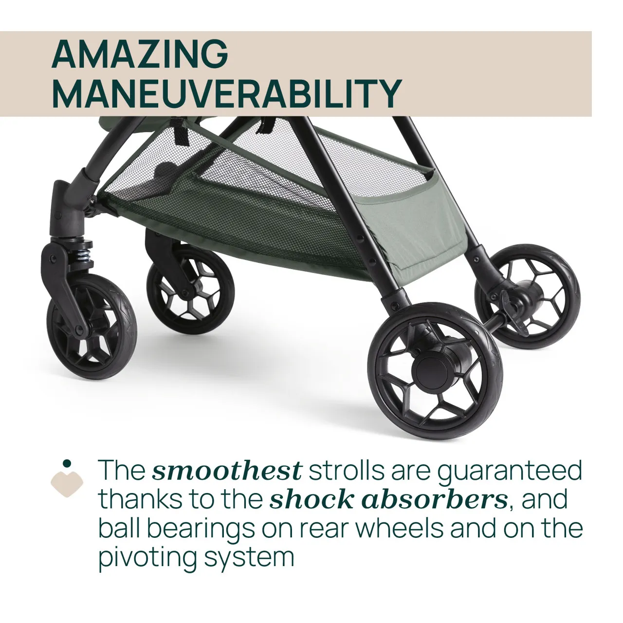 Amortiguadores en todas las ruedas; rodamientos de bolas en las ruedas traseras y en el sistema giratorio para garantizar una gran maniobrabilidad en todas las superficies. Las ruedas delanteras están equipadas con un sistema de bloqueo para conducir en carreteras no asfaltadas.