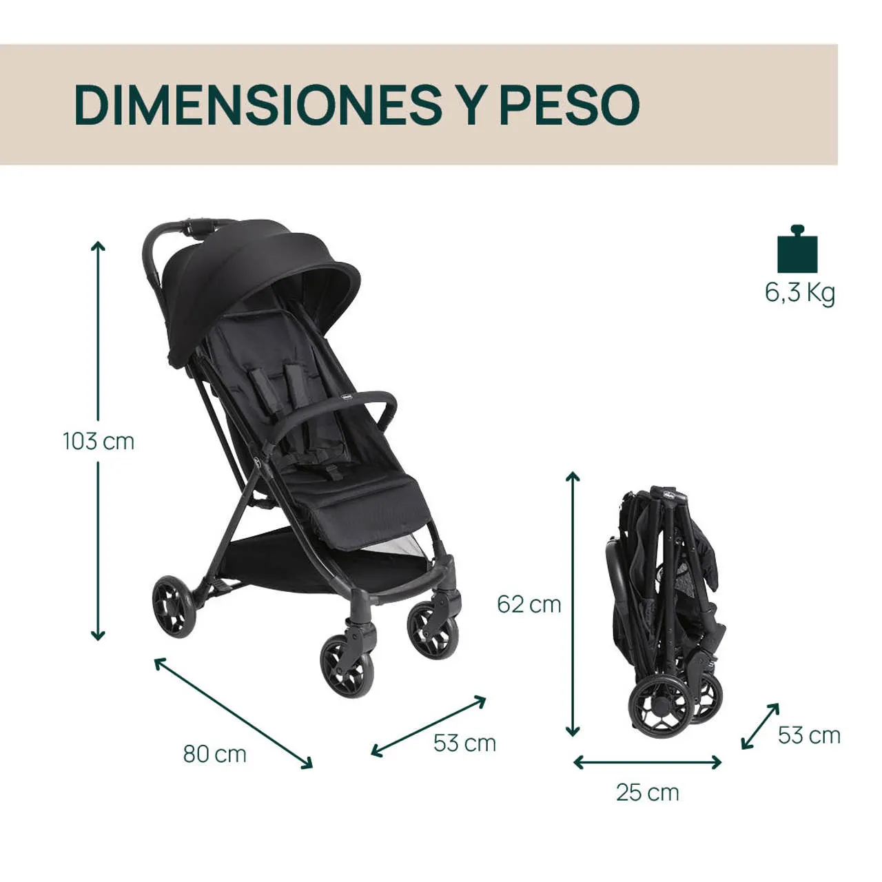 Pesa sólo 6,3kg y, gracias a su tamaño compacto, el cochecito se puede guardar en cualquier lugar.